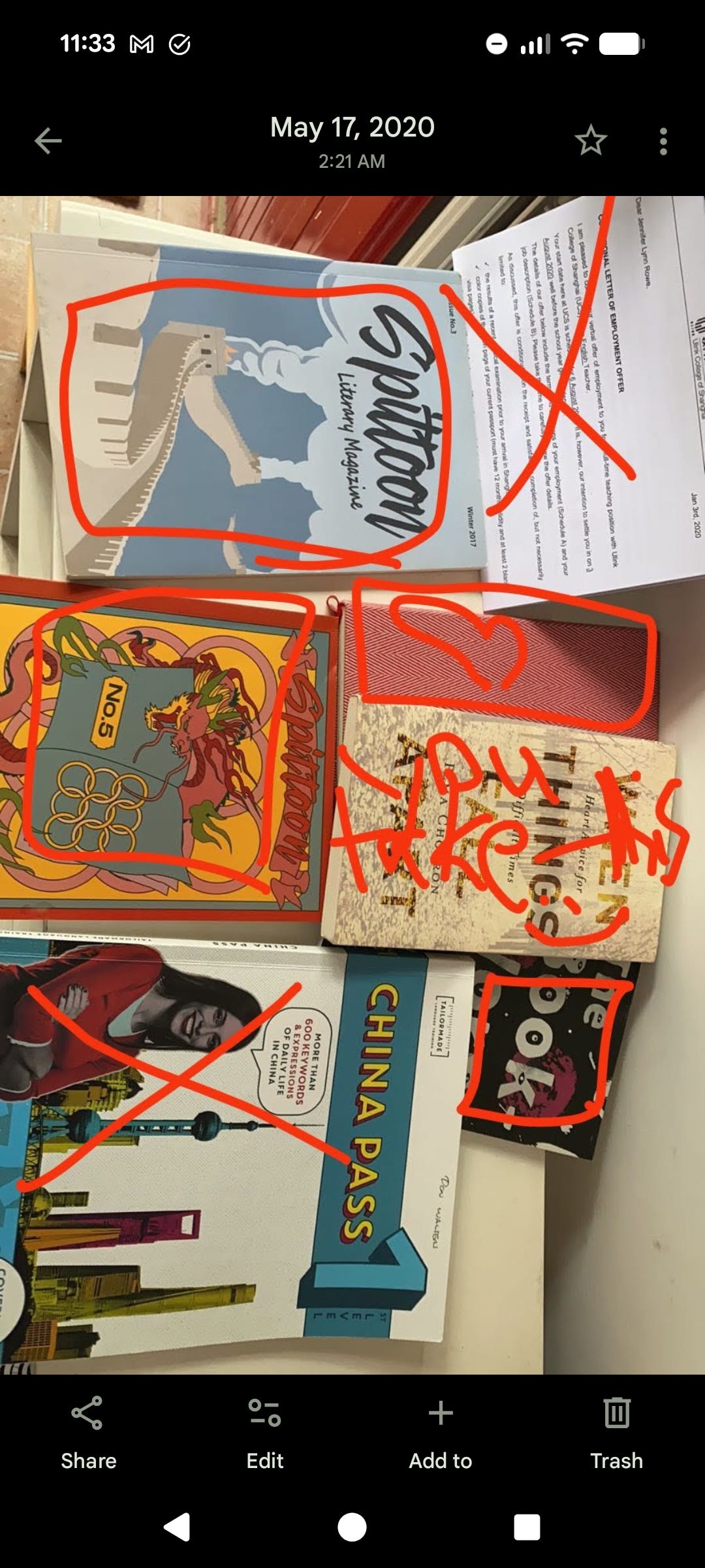 Image description: A pile of books: China Pass, a beginners’ Mandarin language book (which I crossed out), two issues of Spittoon, Beijing’s only bilingual lit mag (which I circled to keep), a red journal (which I of course wanted to keep—it has a heart drawn over it), and a copy of Pema Chodron’s When Things Fall Apart. It’s hard to read, but I scribbled with my phone-pen over it: “You take this. :)”